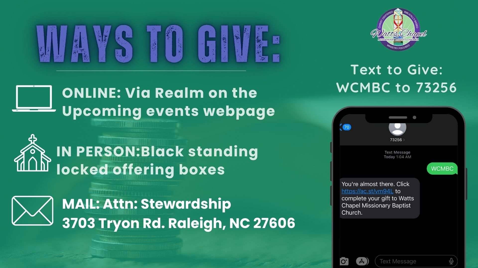 To develop disciples of Jesus Christ who advance the Kingdom of God through worship, evangelism, study, the giving of tithes and offerings, and service.